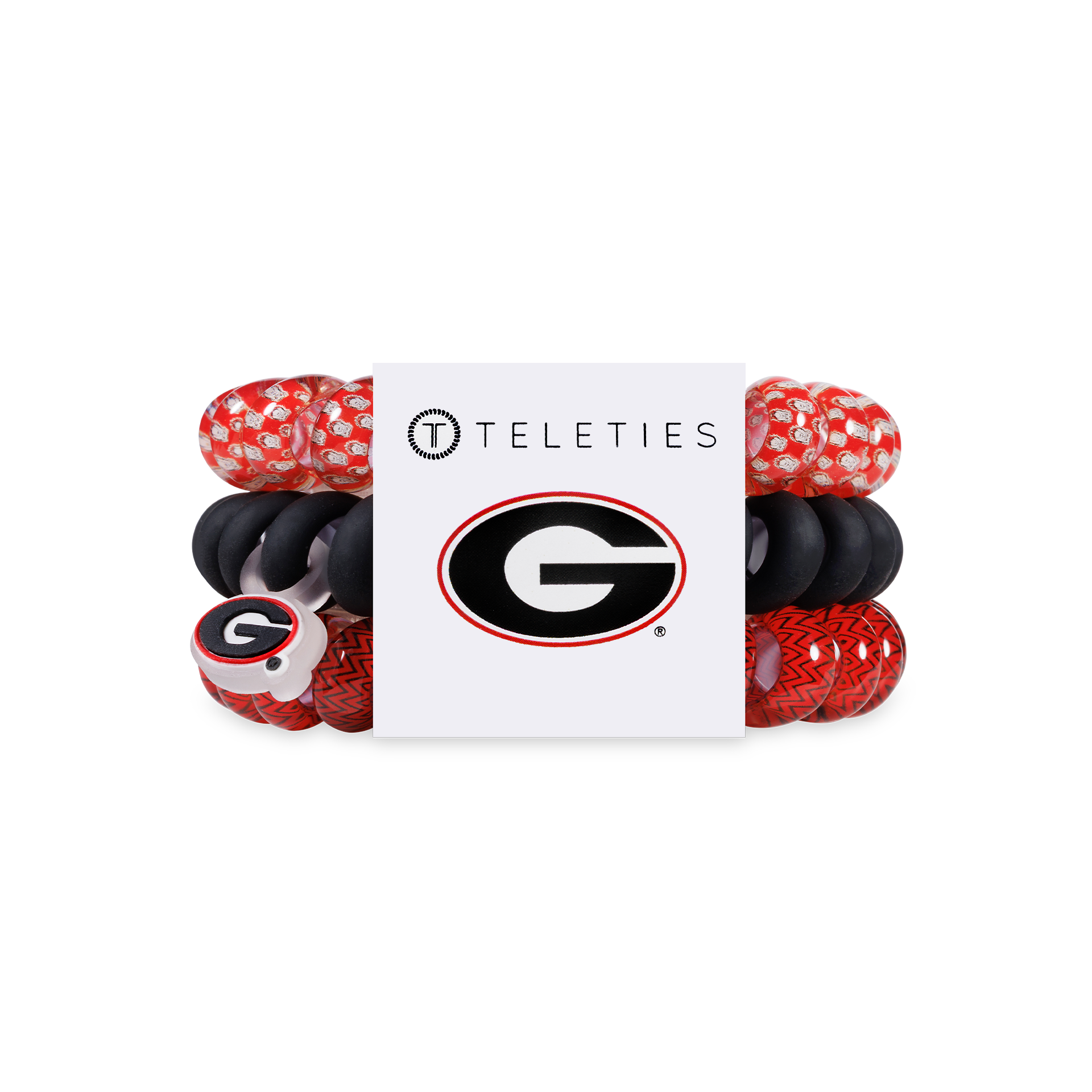 Cheer on the University of Georgia in style with the TELETIES, Go Dawgs! Large Hair Ties in Black and Red offer a strong grip without damage, doubling as a chic wrist accessory when not in use. Your new favorite hair essentials all year round. Shop your favorite University of Georgia hair accessories now! Go Dawgs!